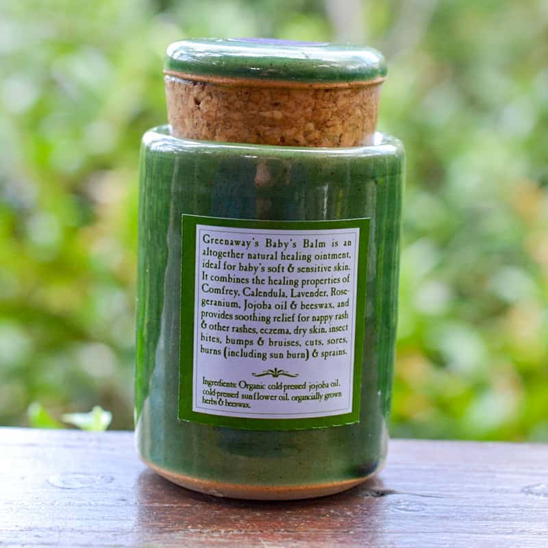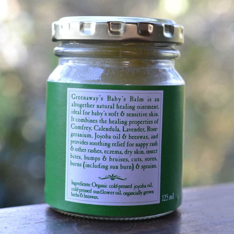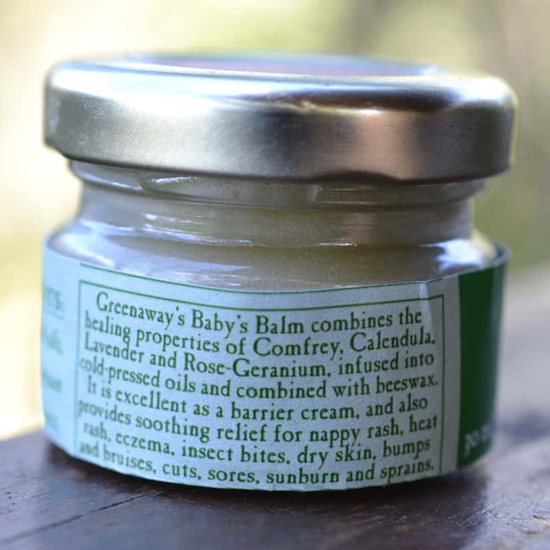 Greenaway’s Baby’s Balm is a natural healing balm, ideal for babies’ soft and sensitive skin. It combines the healing properties of Comfrey, Calendula, Lavender, Rose Geranium, Jojoba oil and beeswax, and provides soothing relief for nappy rash, heat rash, insect bites, dry skin, sunburn, sores, cuts and sprains. It makes an excellent barrier cream and works extremely well with washable nappies.